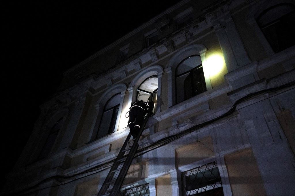 رجل إنقاذ يتفقد مبنى بعد غارة في وسط خاركيف (5 حزيران 2023، أ ف ب).