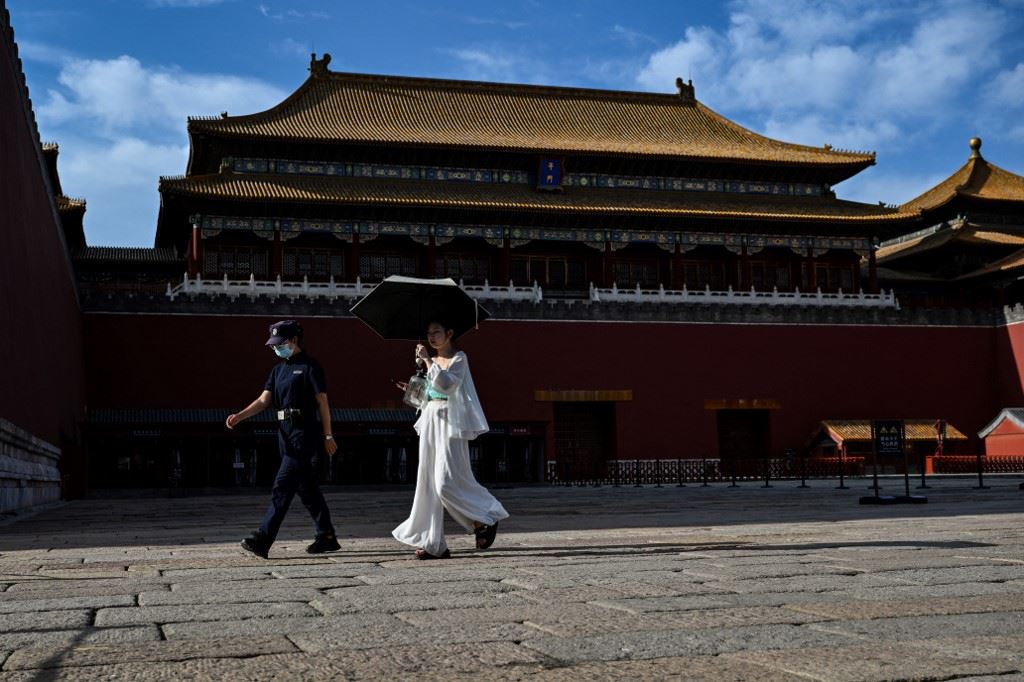 امرأة تمر بجوار مدخل المدينة المحرمة في بيجينغ (7 حزيران 2023، أ ف ب).