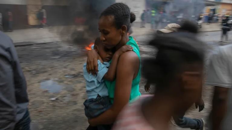 أم تحمل ابنها أمام حاجز مشتعل أثناء احتجاج ضد الحكومة في هايتي، في 18 تشرين الثاني (أسوشيتد برس).