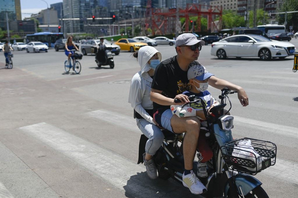 رجل يركب مع أسرته دراجة كهربائية في بيجينغ (11 حزيران 2023، أ ف ب).