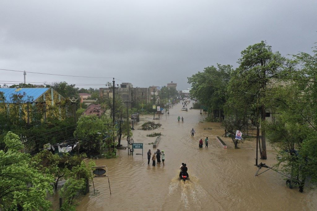 صورة جوية لطريق غارق في السيول في ماندفي من جراء الإعصار "بيبارجوي" (16 حزيران 2023، أ ف ب).