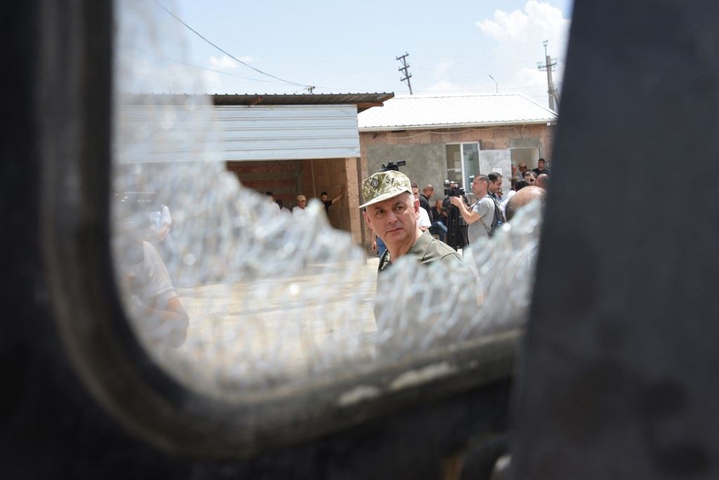 ديبلوماسيون أجانب وملحقون عسكريون يزورون برفقة مسؤولين محليين وجنود أرمن، مستوطنة يراسخ على الحدود مع أذربيجان لتفقد تداعيات ما قيل إنه قصف أذربيجاني (15 حزيران 2023، أ ف ب).