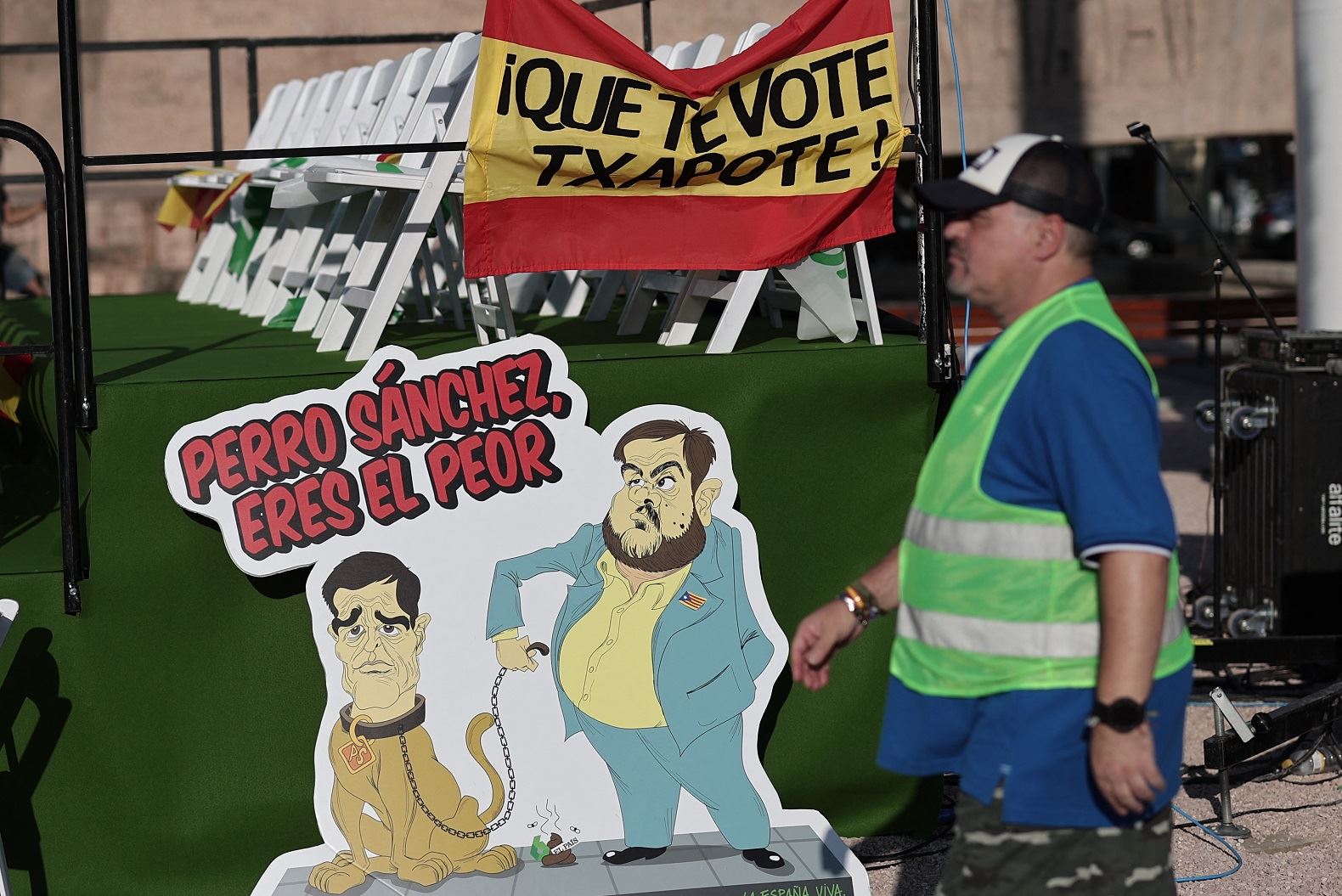 لافتة ساخرة تُصوّر رئيس الوزراء الإسباني بيدرو سانشيز على أنّه كلب، مكتوب عليها "أنت الأسوأ"، في مدريد (21 تموز 2023 - أ ف ب).