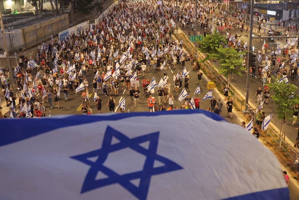 متظاهرون يرفعون الأعلام خلال احتجاج في تل ابيب على خطة الإصلاح القضائي (29 تموز 2023، أ ف ب).