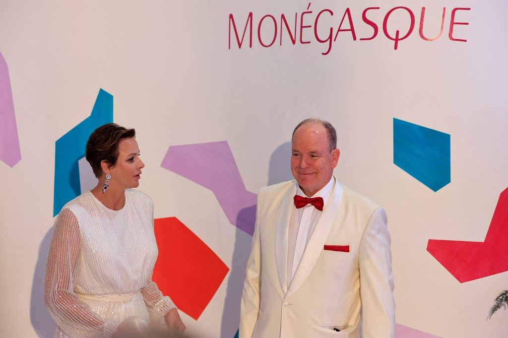 الأمير ألبير الثاني (إلى اليمين) والأميرة شارلين لدى وصولهما لحضور احتفال موناكو للصليب الأحمر السنوي في موناكو (29 تموز 2023ـ أ ف ب).