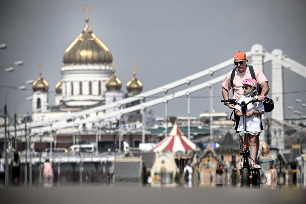 رجل وطفل يركبان دراجة فوق جسر نهر موسكفا في موسكو. وبدت في الخلفية كاتدرائية المسيح المخلص (6 آب 2023، أ ف ب).
