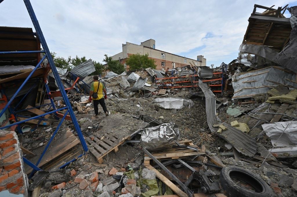رجل يمشي وسط أنقاض مستودع مدمر نتيجة ضربة صاروخية في خاركيف (31 تموز 2023، أ ف ب).