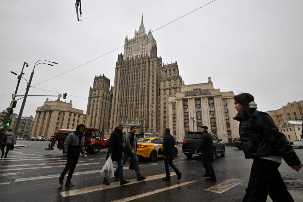 أشخاص يعبرون شارعًا أمام مقر وزارة الخارجية الروسية في موسكو (18 ك2 2023، أ ف ب).