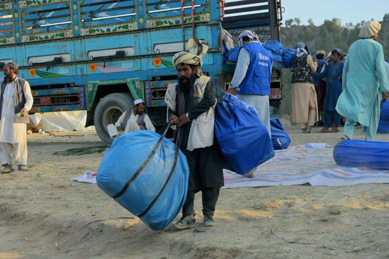 متطوعون يحملون مساعدات مخصصة للأشخاص المتضررين من الزلزال الأخير، في سبيرا في مقاطعة خوست (26 حزيران 2022، أ ف ب).