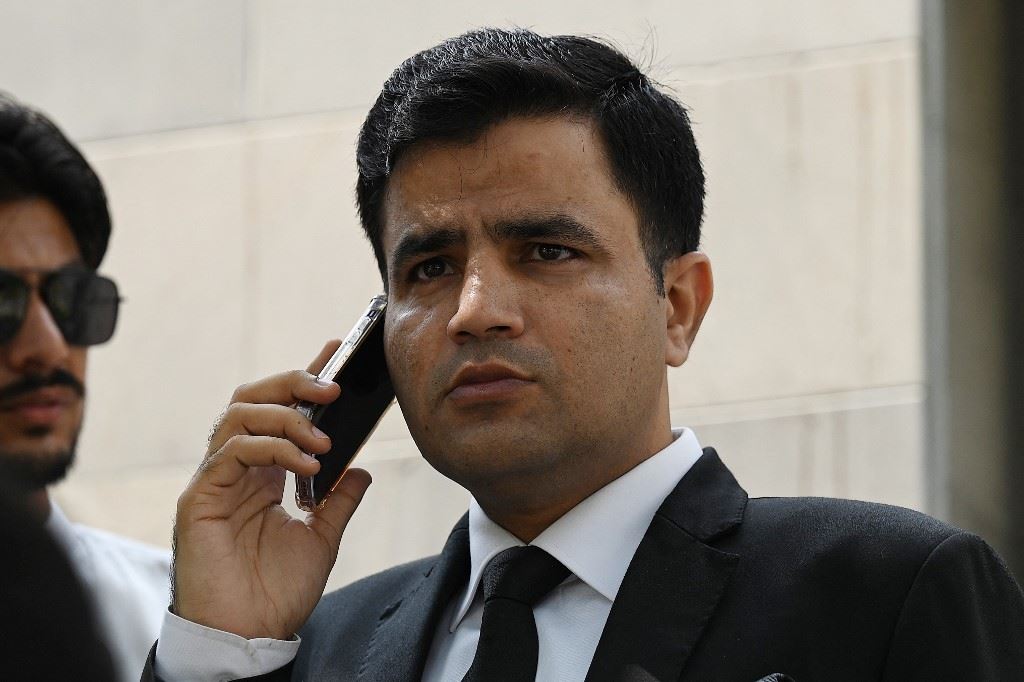 بانجوتا يتحدث عبر هاتفه خارج مبنى المحكمة العليا قبل حضور جلسة استماع في إسلام أباد (9 آب 2023، أ ف ب).