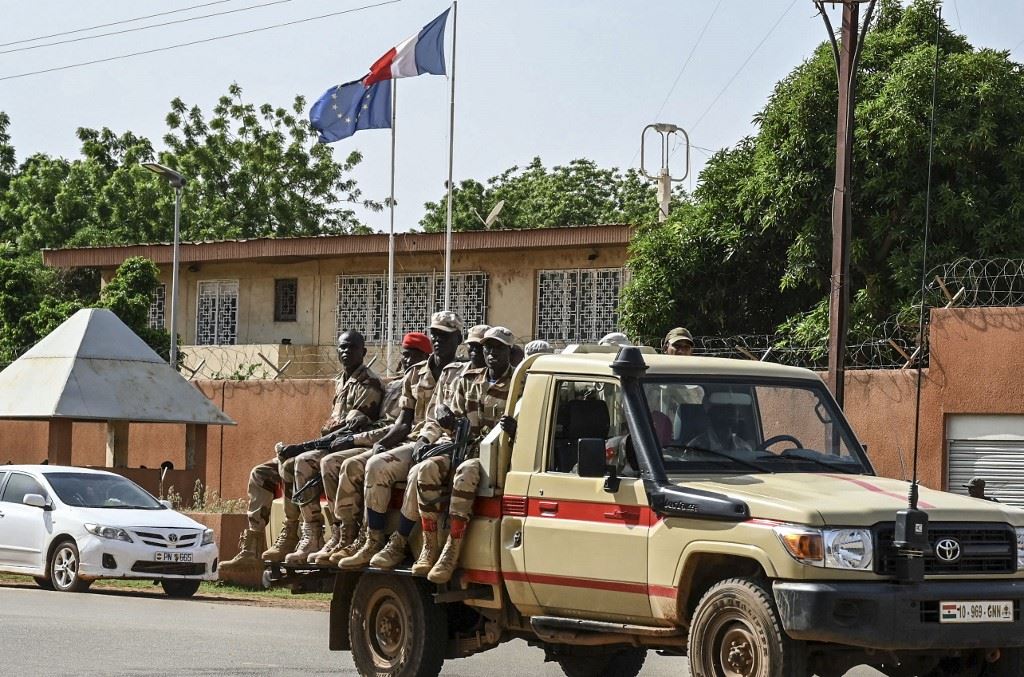 دورية للشرطة النيجرية تمر أمام مقر السفارة الفرنسية في نيامي (28 آب 2023، أ ف ب).