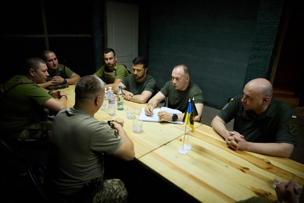 زيلينسكي والعقيد الجنرال أولكسندر سيرسكي (الى اليسار) يزوران الألوية المنخرطة في العمليات الهجومية في قطاع باخموت في دونيتسك (5 ايلول 2023، أ ف ب).