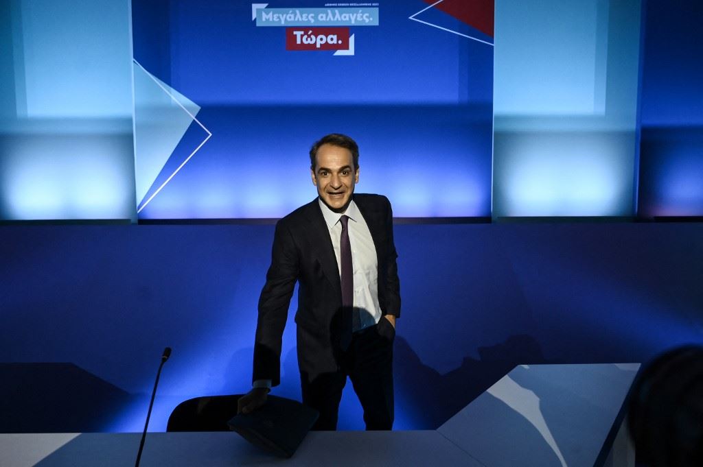 ميتسوتاكيس قبل مؤتمره الصحافي في معرض سالونيك الدولي في سالونيك شمال اليونان (17 ايلول 2023، أ ف ب).