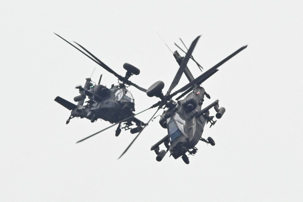 مروحيّتان هجوميّتان من طراز أباتشي خلال حدث عسكريّ في تايوان (أ ف ب).