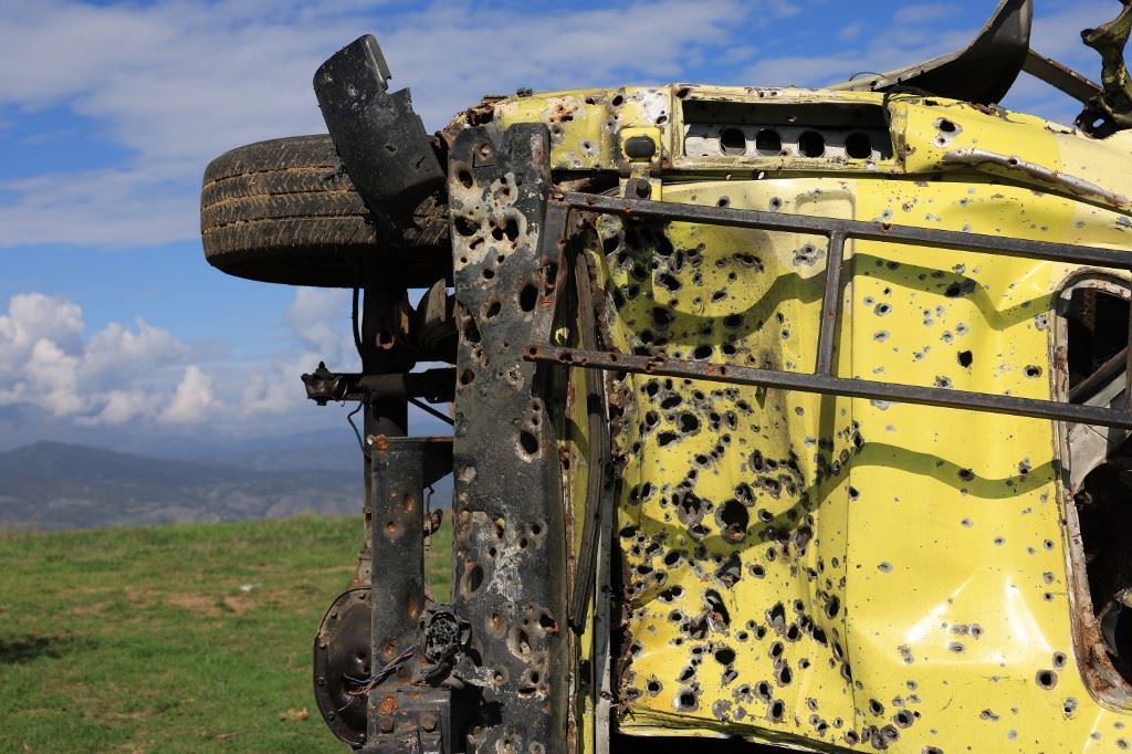 مركبة أرمينية متضررة في قرية مختار التي استعادتها القوات الأذربيجانية في منطقة ناغورنو- كراباخ (3 ت1 2023، أ ف ب).