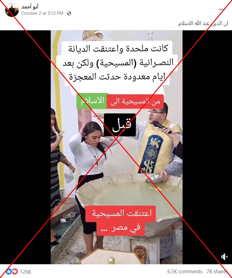 آلاف المشاركات حصدها فيديو يدّعي ناشروه أنّه يُظهر فتاة ملحدة اعتنقت الديانة المسيحيّة، ثمّ أشهرت إسلامها. إلا أنّ الادّعاء غير صحيح. فالفيديو يظهر فتاتين مختلفتين. الأولى اعتنقت المسيحيّة في البرازيل خلال الأشهر الماضية. أمّا الثانية، فأشهرت إسلامها في فرنسا عام 2021.