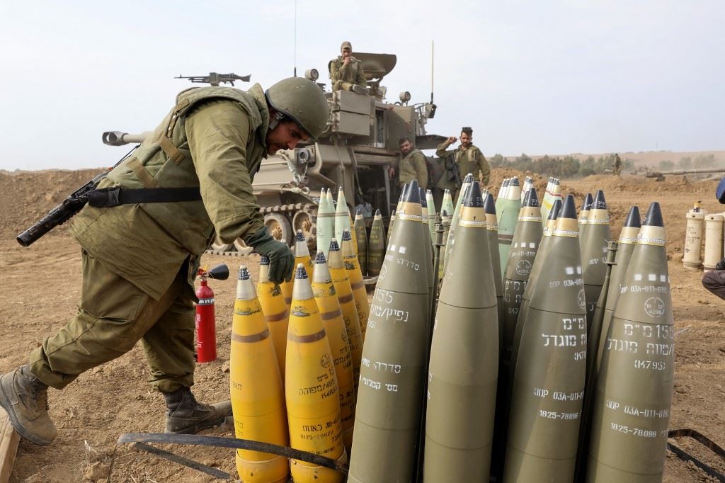 جندي إسرائيلي يرتب قذائف مدفعية على الحدود مع غزة (أ ف ب).