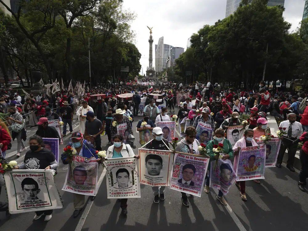 صورة ارشيفية- أقارب لـ43 من طلاب كلية أيوتزينابا المفقودين ورفاق لهم خلال مسيرة في مكسيكو سيتي في ذكرى اختفائهم (26 أيلول 2022، أ ب).