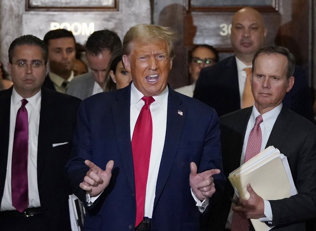 ترامب مصرحا للصحافة خلال استراحة من المحكمة (17 ت1 2023، أ ف ب).