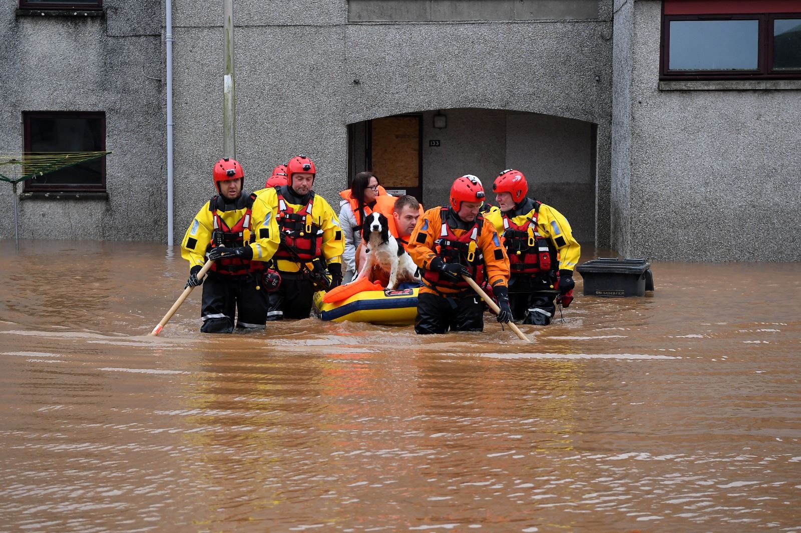 رجال انقاذ ينقلون زوجين وكلبهما في زورق في بريشين شمال شرق اسكتلندا (20 ت1 2023، أ ف ب).
