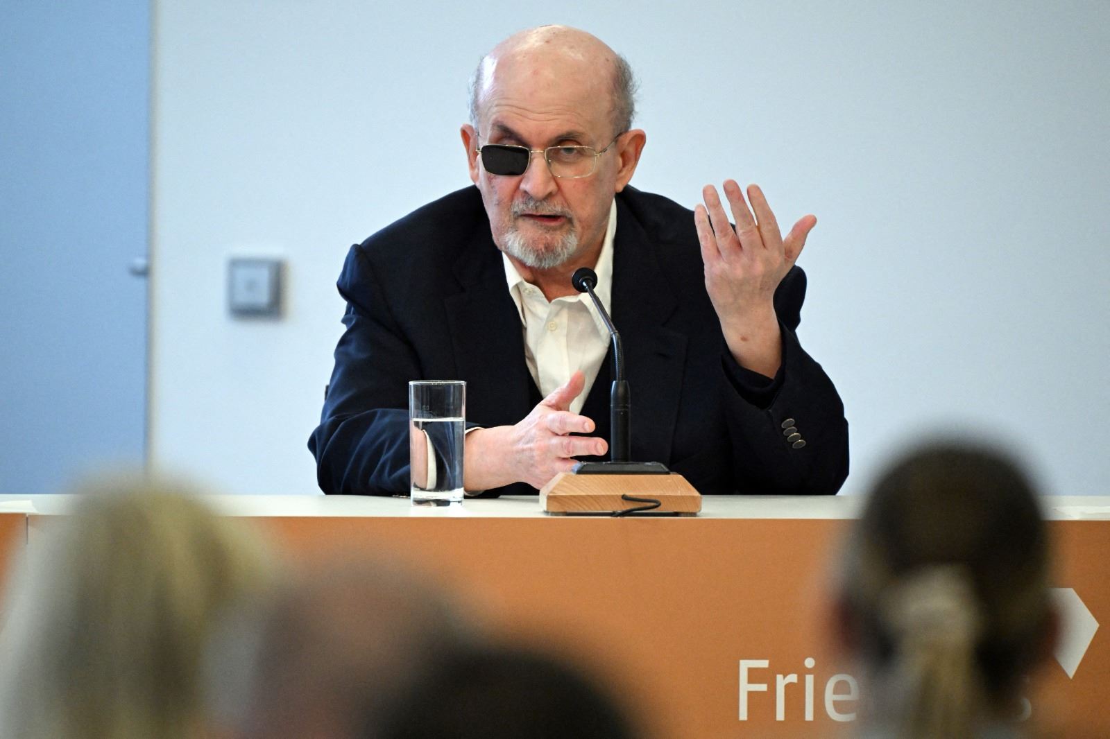 رشدي متكلما خلال مؤتمر صحافي في معرض فرانكفورت للكتاب في فرانكفورت أم ماين غرب ألمانيا (20 ت1 2023، أ ف ب).
