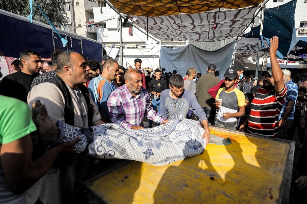 أشخاص ينقلون جثة أحد ضحايا القصف الإسرائيلي، الى عربة خارج مستشفى الشفاء في مدينة غزة (8 ت2 2023، أ ف ب).