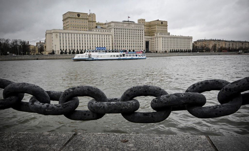 سفينة سياحية تعبر نهر موسكفا قبالة مقر وزارة الدفاع الروسية في موسكو (13 ت2 2023، أ ف ب).