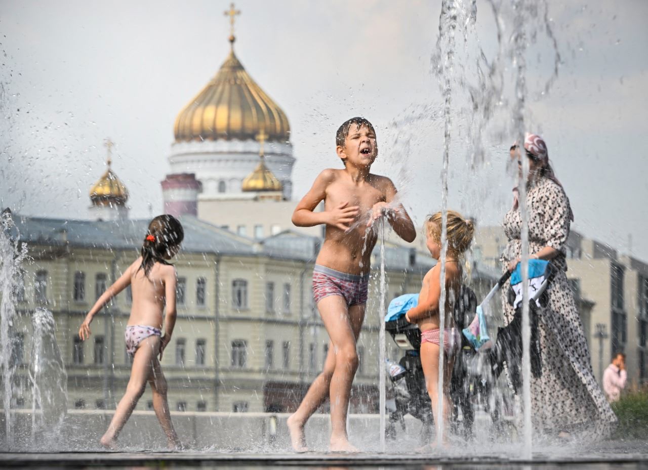 أطفال ينعشون أنفسهم بمياه نافورة وسط موسكو (27 تموز 2022، أ ف ب).