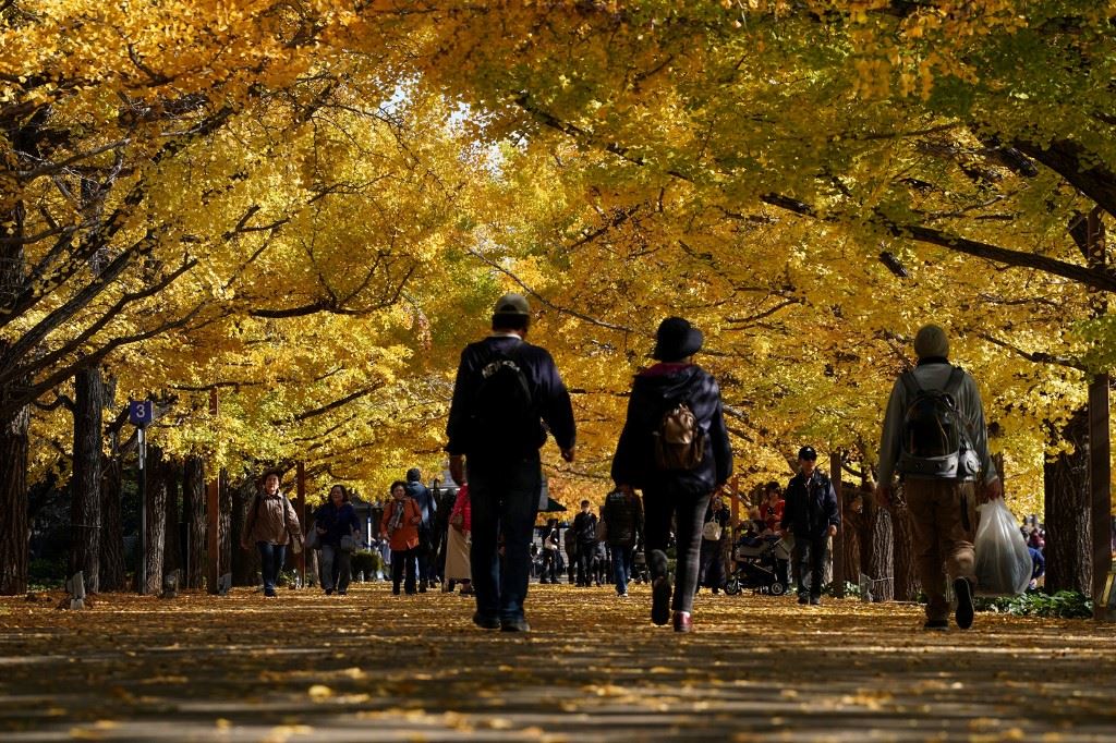 أشخاص يتجولون في حديقة شو كينين في تاتشيكاوا بمحافظة طوكيو (21 ت2 2023، أ ف ب).