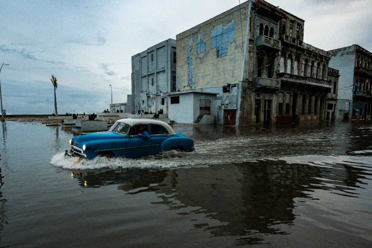 سيارة أميركية قديمة تمر في شارع غمرته المياه في هافانا بعد مرور إعصار إيان (28 أيلول 2022، أ ف ب).