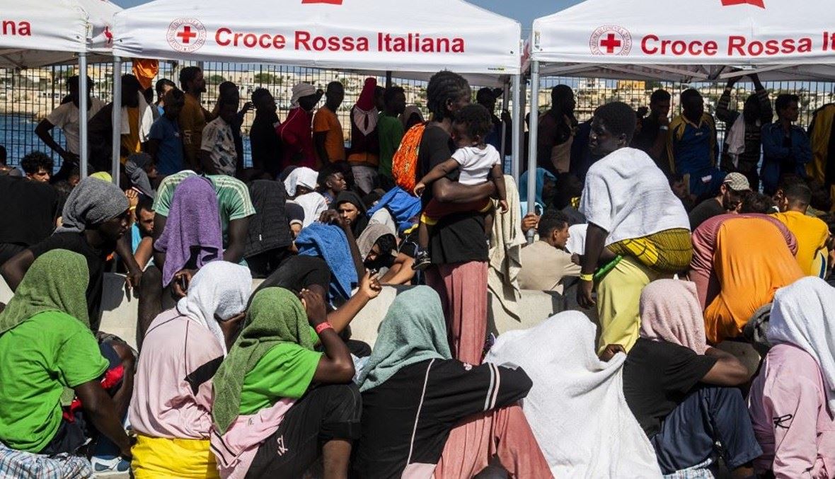صورة ارشيفية- مهاجرون تجمعوا في ميناء جزيرة لامبيدوسا الإيطالية (15 ايلول 2023، أ ف ب).