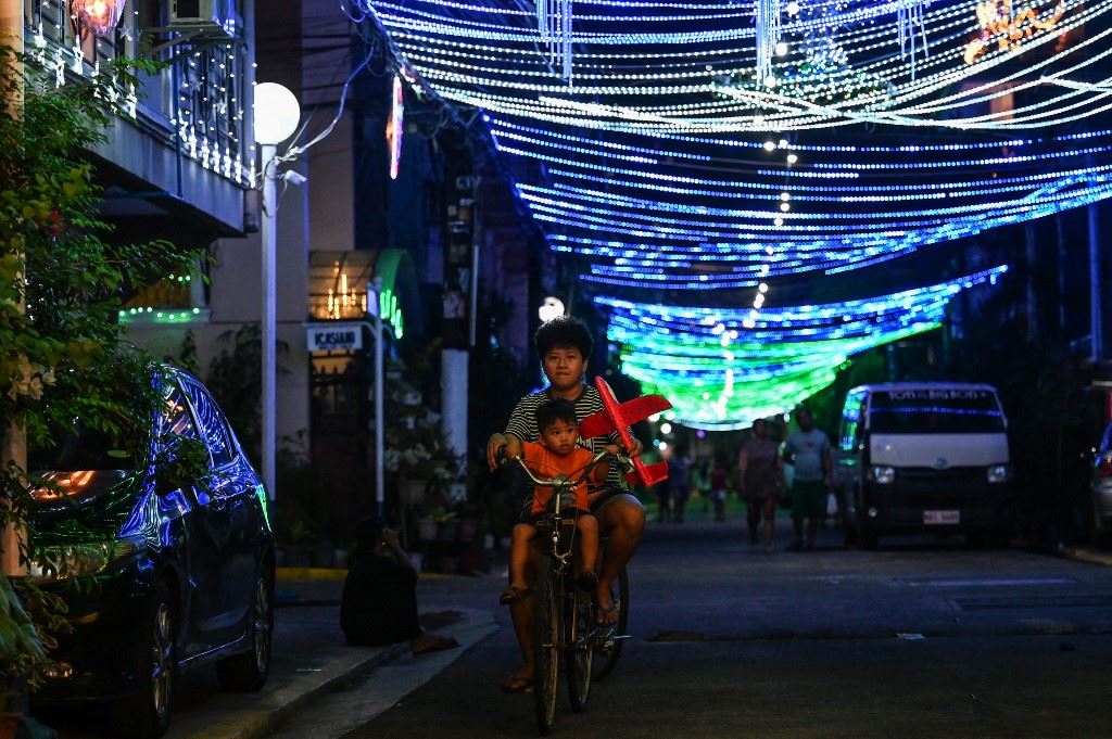 امرأة وطفل يركبان دراجة في شارع في مانيلا (21 ك1 2022، أ ف ب).