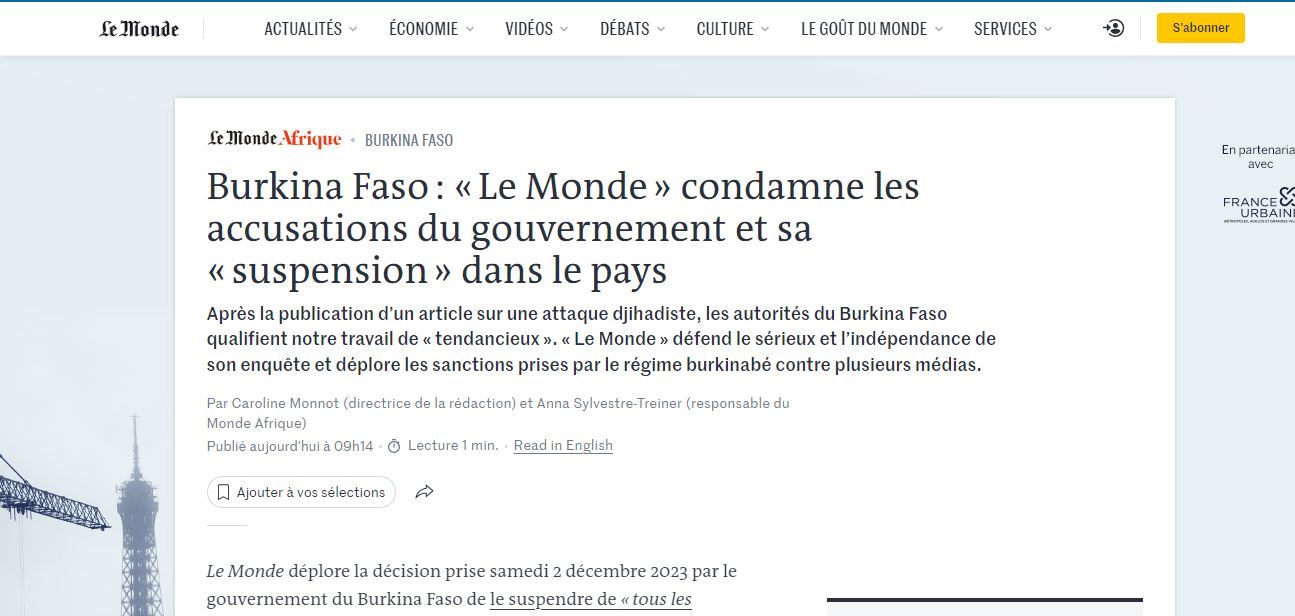 لقطة لمقالة "لوموند" حول "تعليق" نشرها في بوركينا فاسو (موقع الصحيفة).