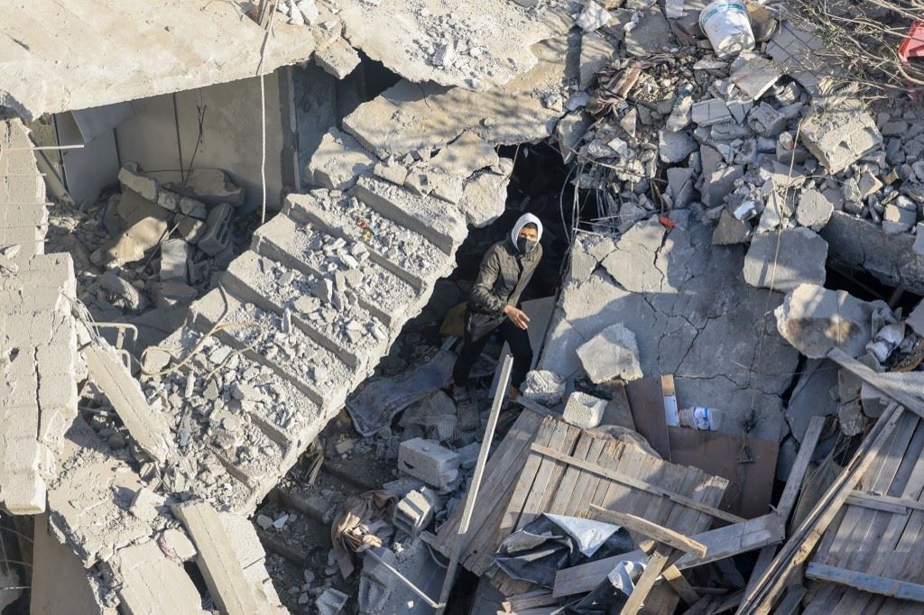 رجل داخل مبنى دمره الجيش الإسرائيلي في رفح. (أ ف ب)