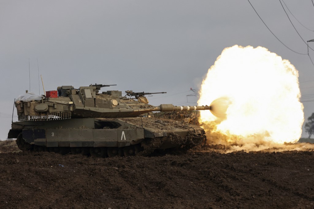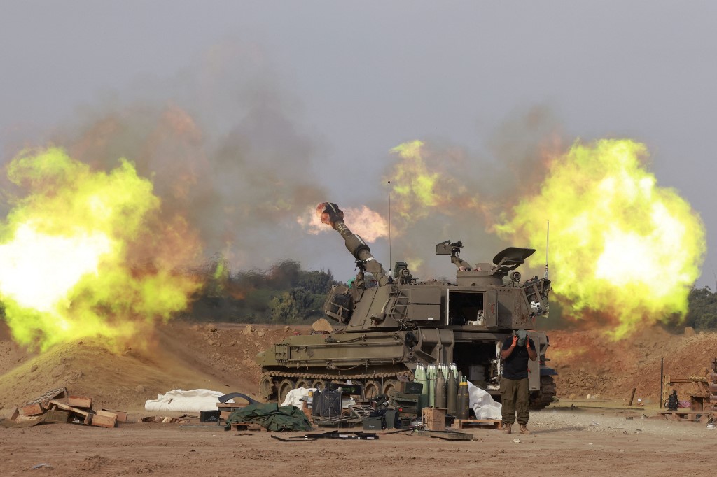 (مدفع "هاوتزر" ذاتية الدفع تابع للجيش الإسرائيلي يطلق قذائف من موقع بالقرب من الحدود مع قطاع غزة- أ ف ب)