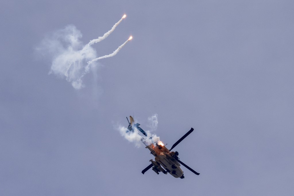(مروحية إسرائيلية تطلق قنابل مضيئة أثناء تحليقها فوق قطاع غزة- أ ف ب)