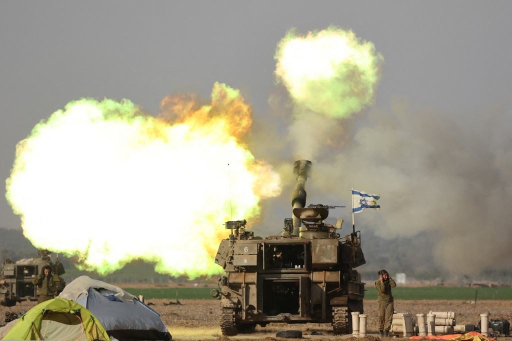قوات إسرائيلية تقصف قطاع غزة من المنطقة الحدودية في جنوب إسرائيل (12 ك1 2023، أ ف ب).