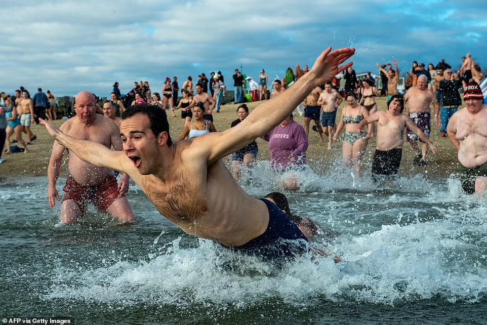 ألقى العشرات من الأشخاص بأنفسهم الاثنين في المياه الجليدية لمدينة بوسطن الأميركية، عملاً بتقليد متبّع منذ 120 عاماً تُطلق عليه تسمية "الغطس القطبي" (Polar Plunge) لرأس السنة.