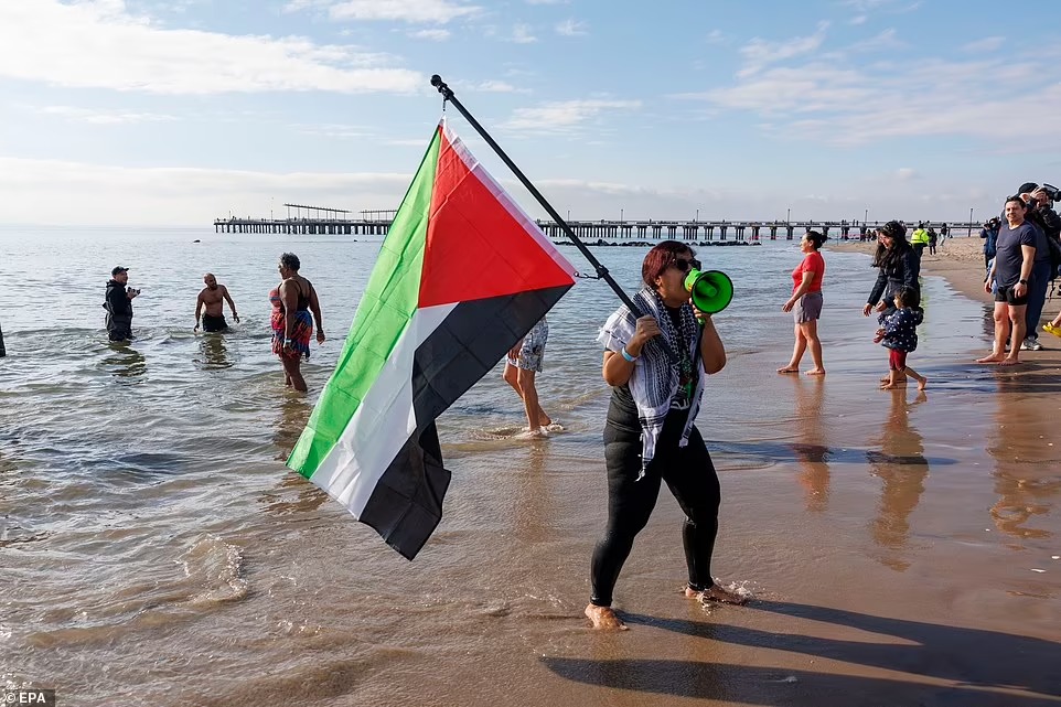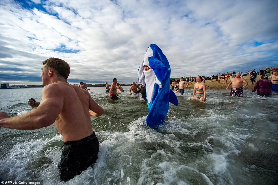وعلى وقع أصوات مزامير القربة، غاص السبّاحون الجريئون في المياه التي لا تتعدّى حرارتها ست درجات، احتفالاً ببداية السنة الجديدة.