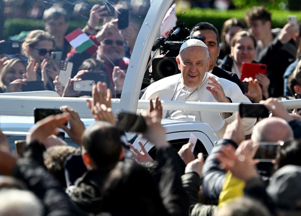 البابا فرنسيس ملوحا لدى وصوله للاحتفال بالقداس في ساحة كوسوث لايوس في بودابست (30 نيسان 2023، أ ف ب).