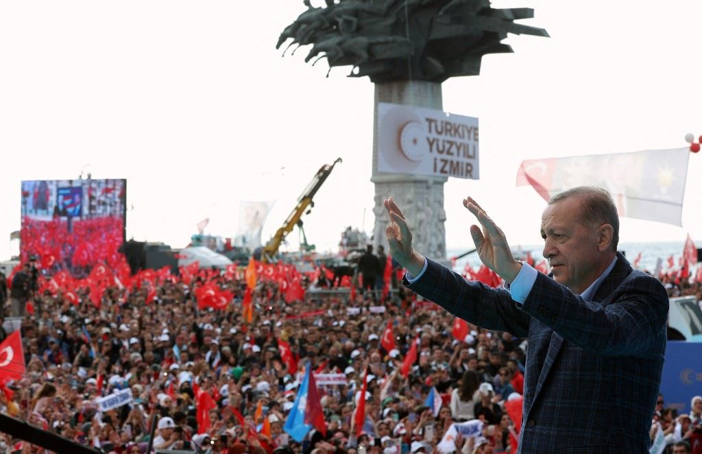 إردوغان خلال تجمع انتخابي في ساحة غوندوغدو في إزمير (29 نيسان 2023، أ ف ب).