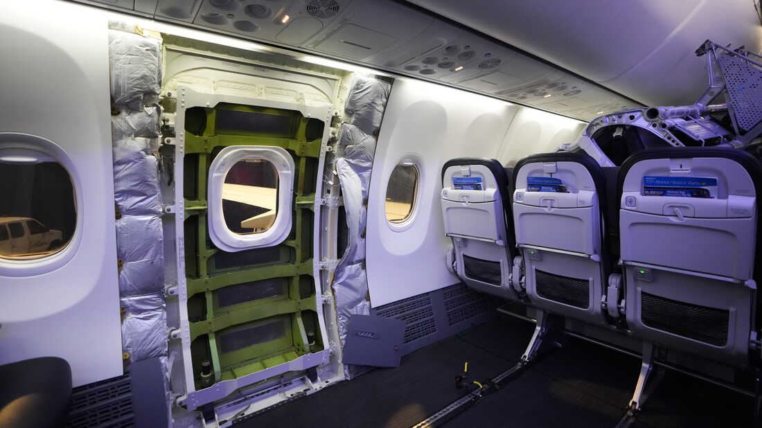 نافذة الطائرة التابعة لشركة "ألاسكا إيرلاينز" والتي انخلعت من مكانها على إثر الإقلاع من مطار بورتلاند في ولاية أوريغون، شمال غرب الولايات المتحدة (5 ك2 2024أ ب).