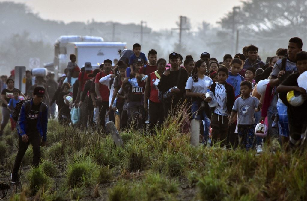 مهاجرون يسيرون ضمن قافلة تتجه نحو الحدود مع الولايات المتحدة، في أرياغا بولاية تشياباس بالمكسيك (8 ك2 2024، أ ف ب).