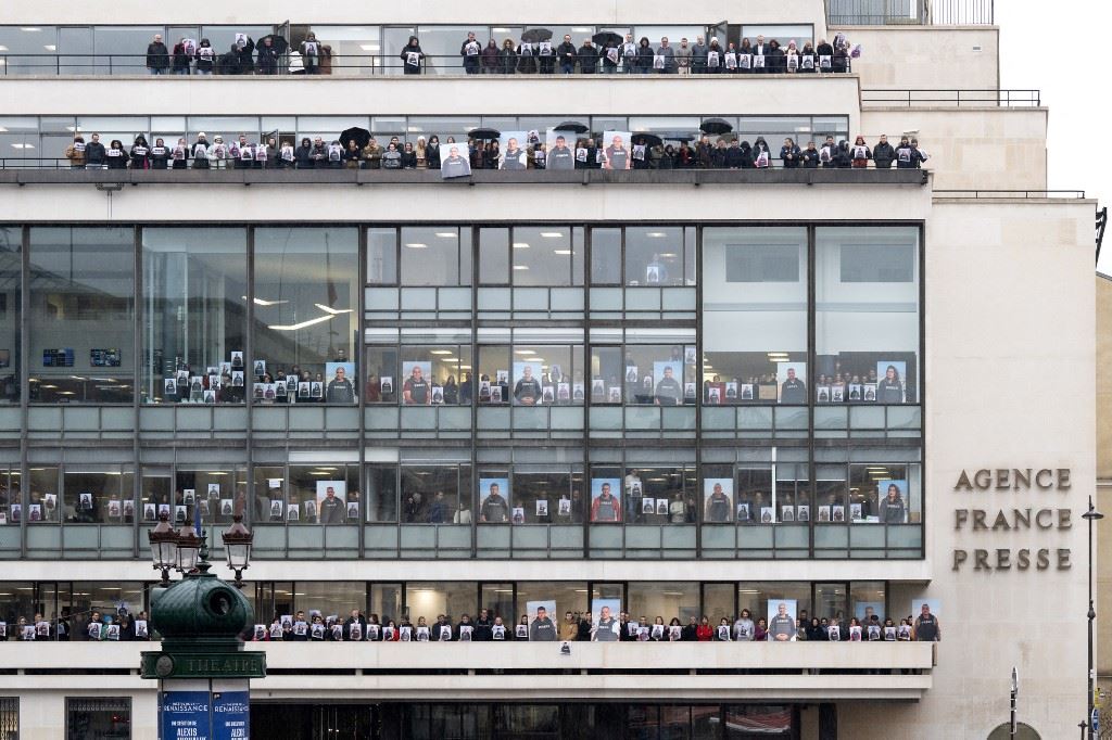 ورفع صحافيو وموظفو الوكالة في مقرها الرئيسي في باريس وفي مكاتبها العديدة في مختلف أنحاء العالم صور زملائهم في غزة خلال الوقفة التضامنية التي نظمتها إدارة الوكالة بالتنسيق مع النقابات وجمعية الصحافيين.