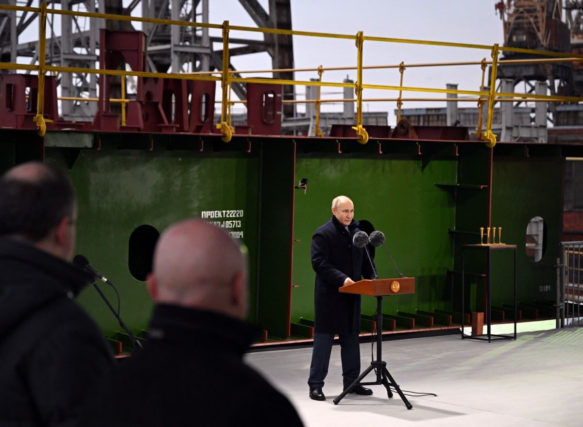 بوتين خلال الاحتفال ببدء بناء كاسحة الجليد، في حوض بناء السفن على بحر البلطيق في سان بطرسبرج (26 ك2 2024، أ ف ب).