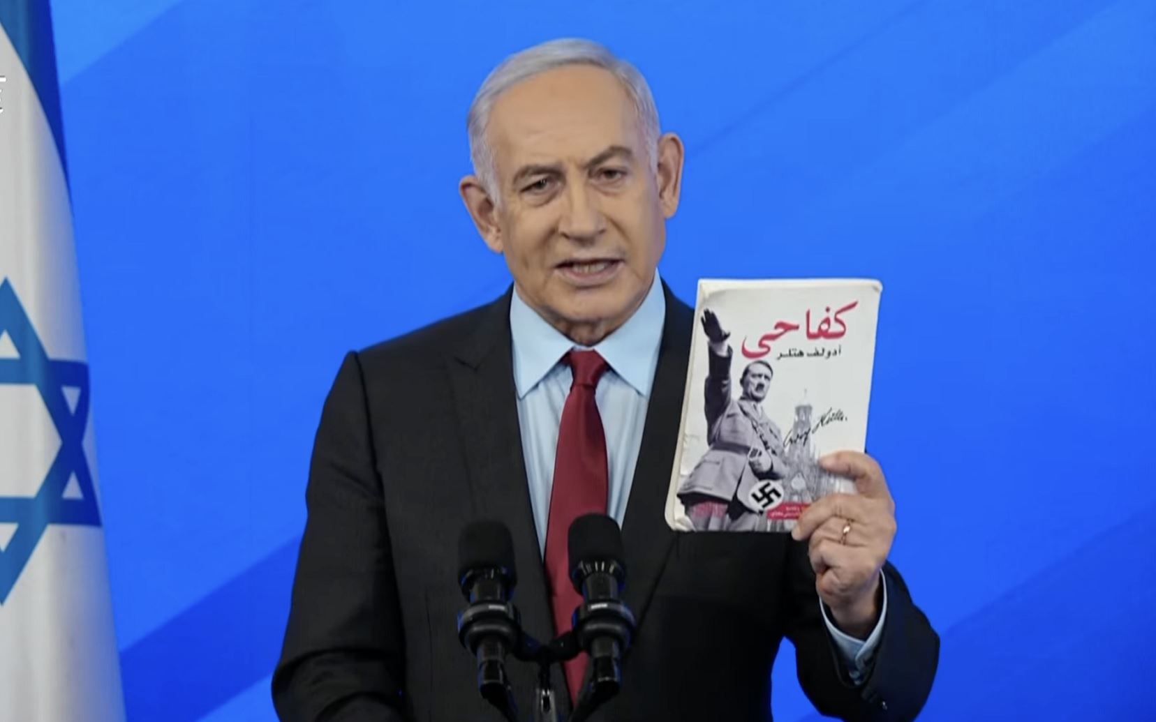 حمل رئيس الوزراء الإسرائيلي بنيامين نتنياهو في مؤتمره الصحافي، اليوم، نسخة عربية من كتاب "كفاحي" لـأدولف هتلر، زعمت صحيفة "تايمز أوف إسرائيل" أنّه وُجِد في قطاع غزة، ونقلت عن نتنياهو قوله: "هكذا يعلّم بها النازيون الجدد أطفالهم".
