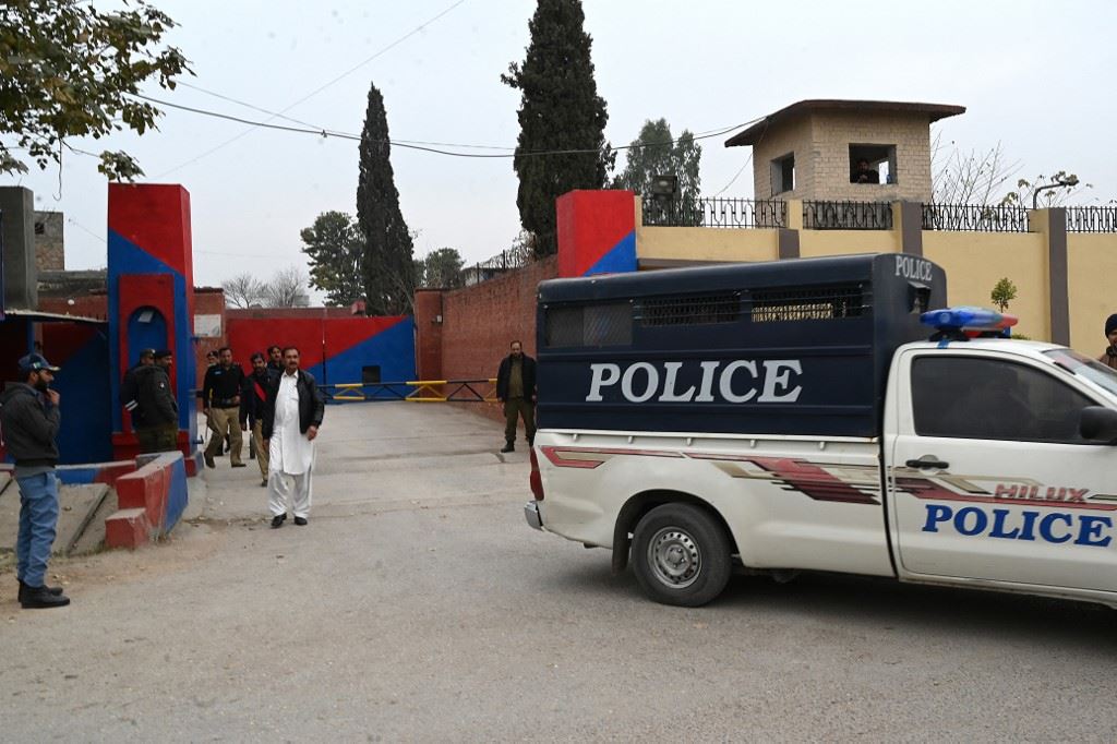 عناصر من الشرطة يقفون خارج مدخل سجن أديالا في روالبندي خلال جلسة محاكمة خان (30 ك2 2024، أ ف ب).