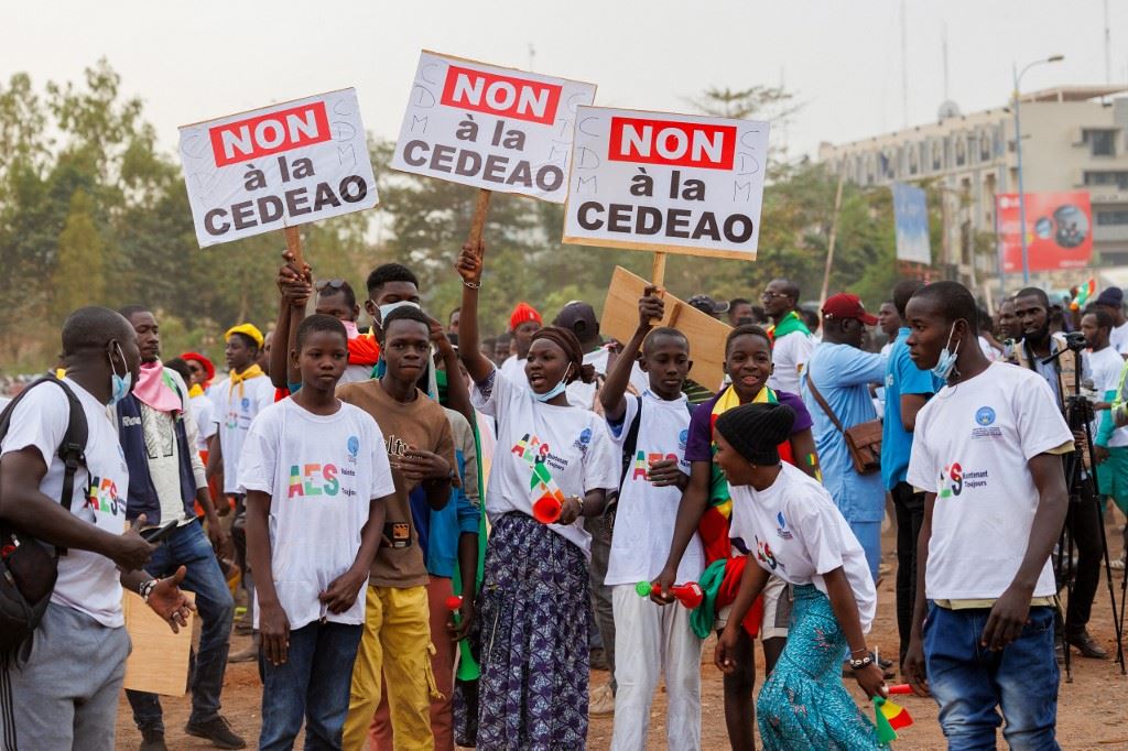 مؤيدون لتحالف دول الساحل يحملون لافتات مناهضة لإكواس خلال مسيرة في باماكو للاحتفال بخروج مالي وبوركينا فاسو والنيجر من المجموعة الاقتصادية لدول غرب أفريقيا (1 شباط 2024، أ ف ب).