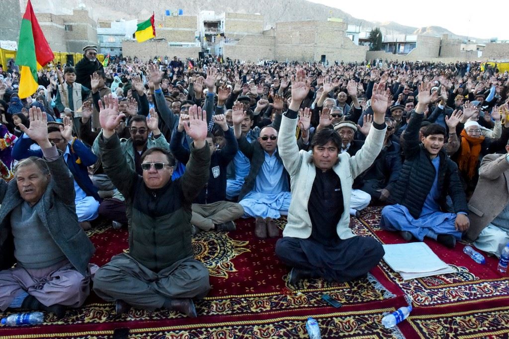 أنصار لحزب الهزارة الديموقراطي خلال اعتصام احتجاجي في كويتا وسط مزاعم عن تزوير الأصوات في الانتخابات الوطنية الباكستانية (14 شباط 2024، أ ف ب).