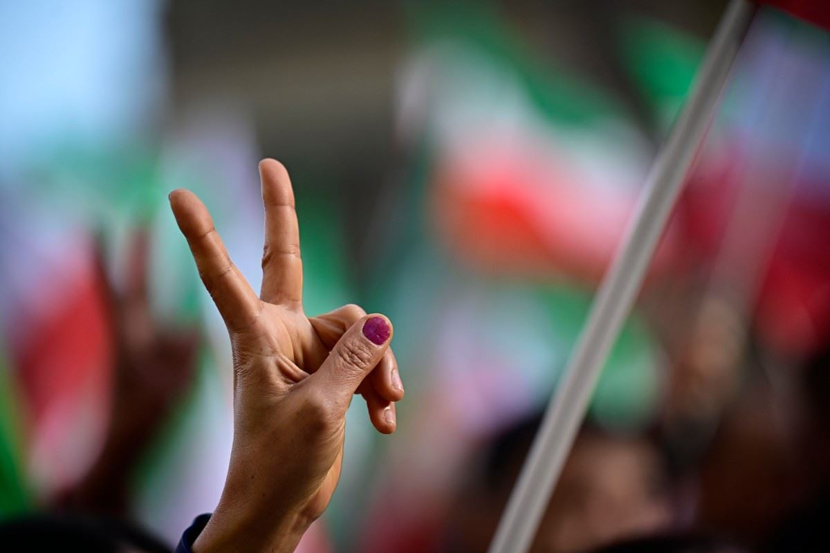 امرأة ترفع علامة النصر أثناء مشاركتها في تظاهرة ضدّ النظام الإيراني في ميونيخ (أ ف ب).